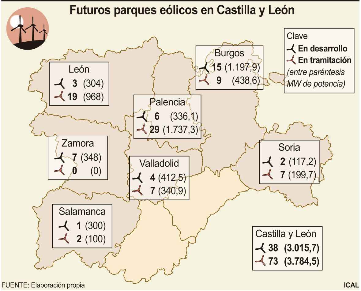 No obstante, y según figura en el Boletín Oficial de las Cortes de Castilla y León de 5 de abril de 2021, existen otros 73 proyectos de parques de gran envergadura, con una potencia instalada superior a los 40 megavatios, que se encuentran en tramitación administrativa y que, salvo desistimiento de las empresas promotoras o defectos en el proyecto que paralicen su autorización, sumarían cerca de 3.785 megavatios de potencia al parque eólico de Castilla y León.