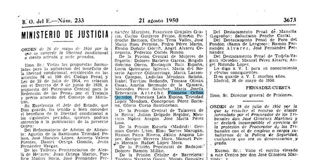 Filomena Ochoa Quindós obtuvo la libertad condicional en 1950.