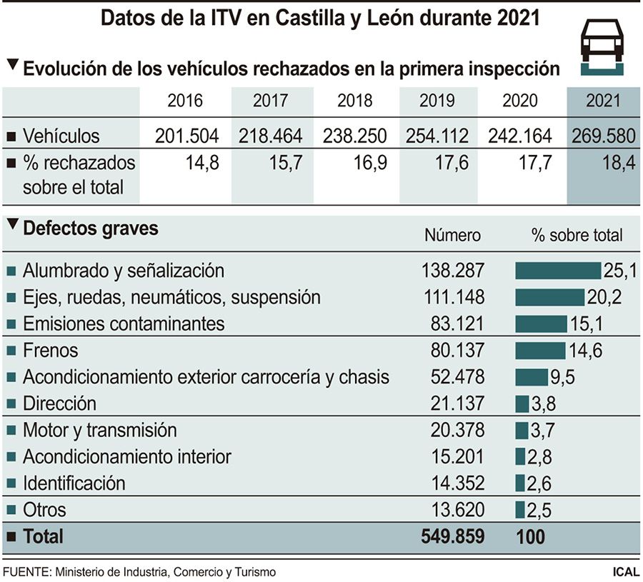 Según datos del Ministerio de Industria, Comercio y Turismo recogidos por Ical, el pasado año se registraron en la Comunidad 1.464.676 inspecciones en las que se detectaron un total de 2.298.822 defectos, de los que el 29,1 por ciento son defectos graves, los que que automáticamente imposibilitan que un vehículo pueda superar la inspección técnica.