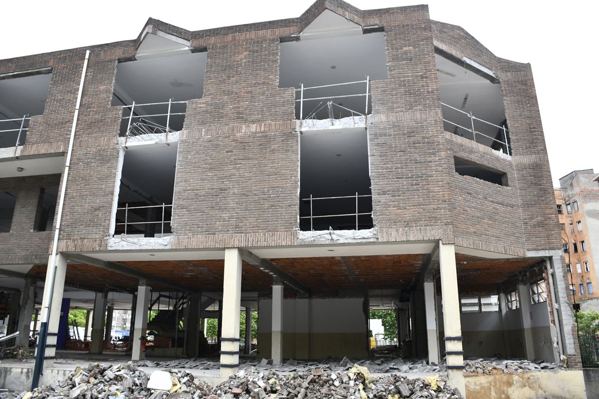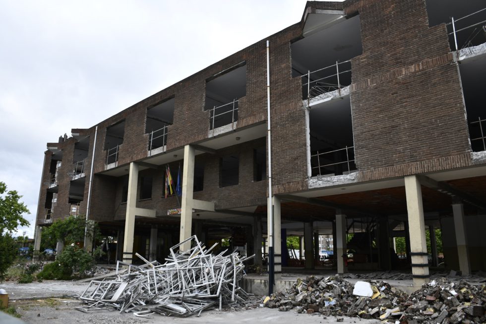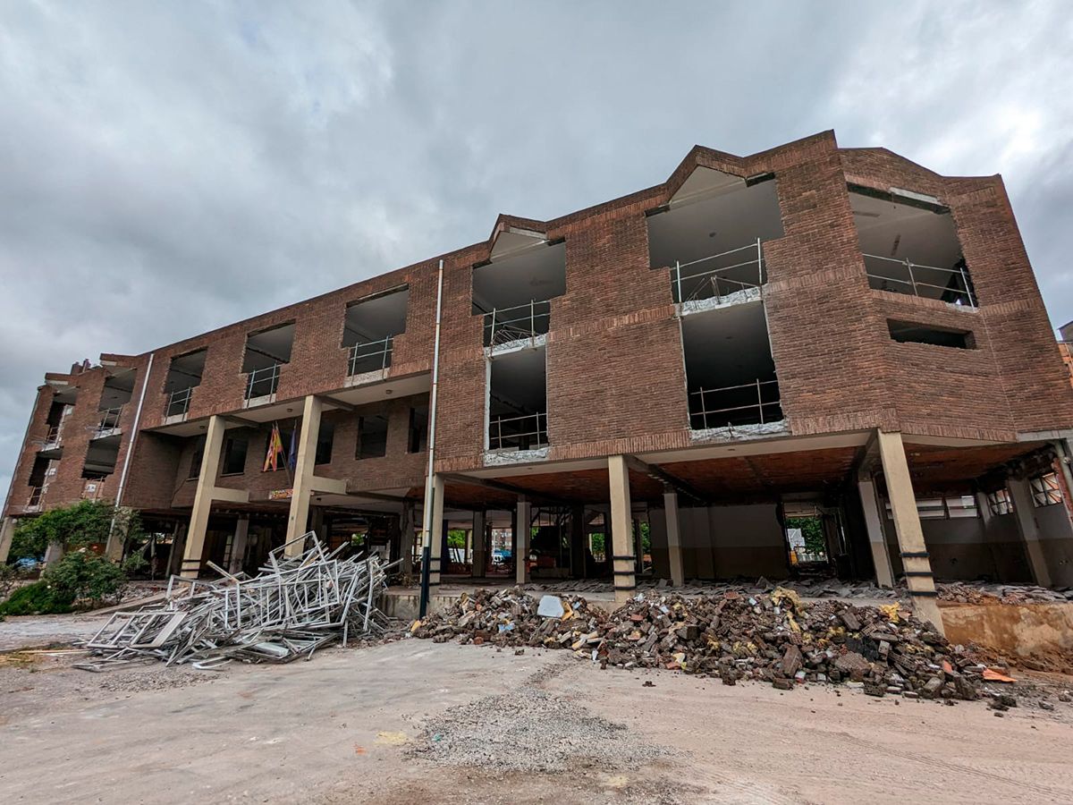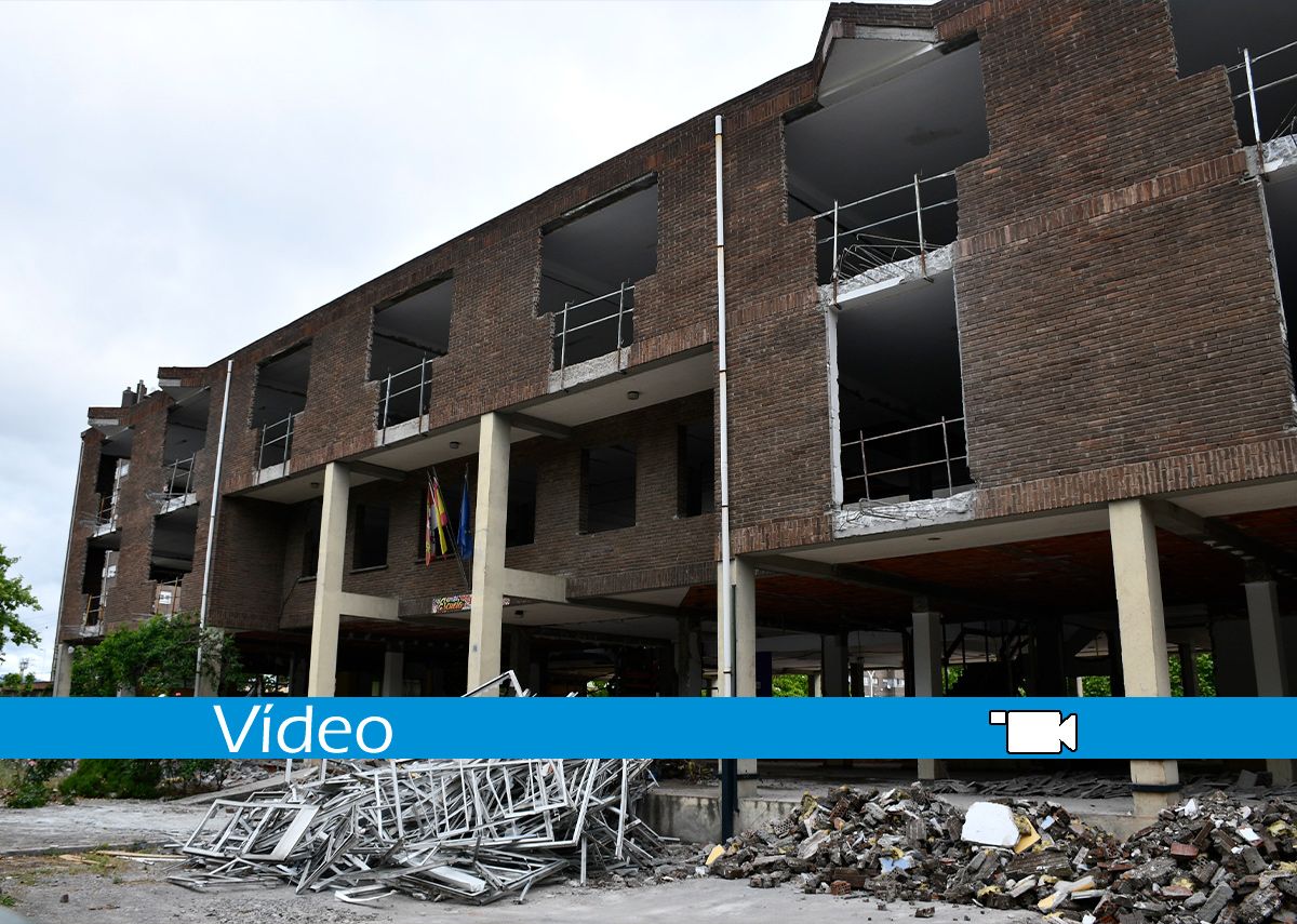 La infraestructura de la Escuela Hogar de Ponferrada en la Avenida del Reino de León ya casi es historia urbana. Las obras del futuro Colegio Mayor de la ULE en el Campus de Ponferrada han comenzado, por lo que el edificio que durante años sirvió de espacio educativo y alojamiento para estudiantes, ahora está 'en los huesos' esperando su reconversión.