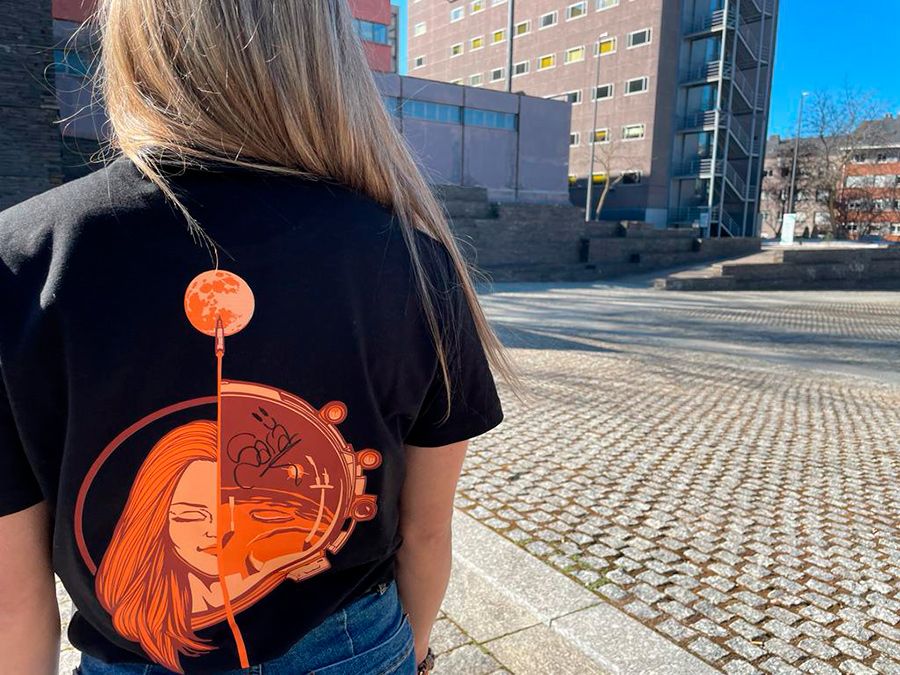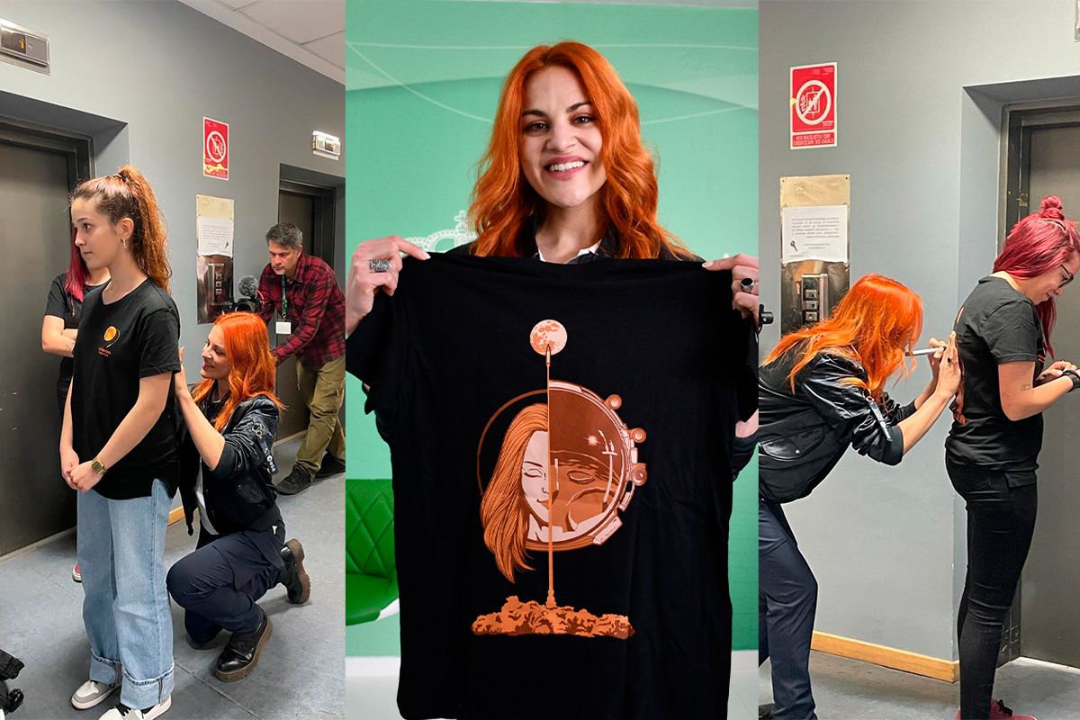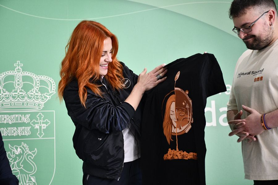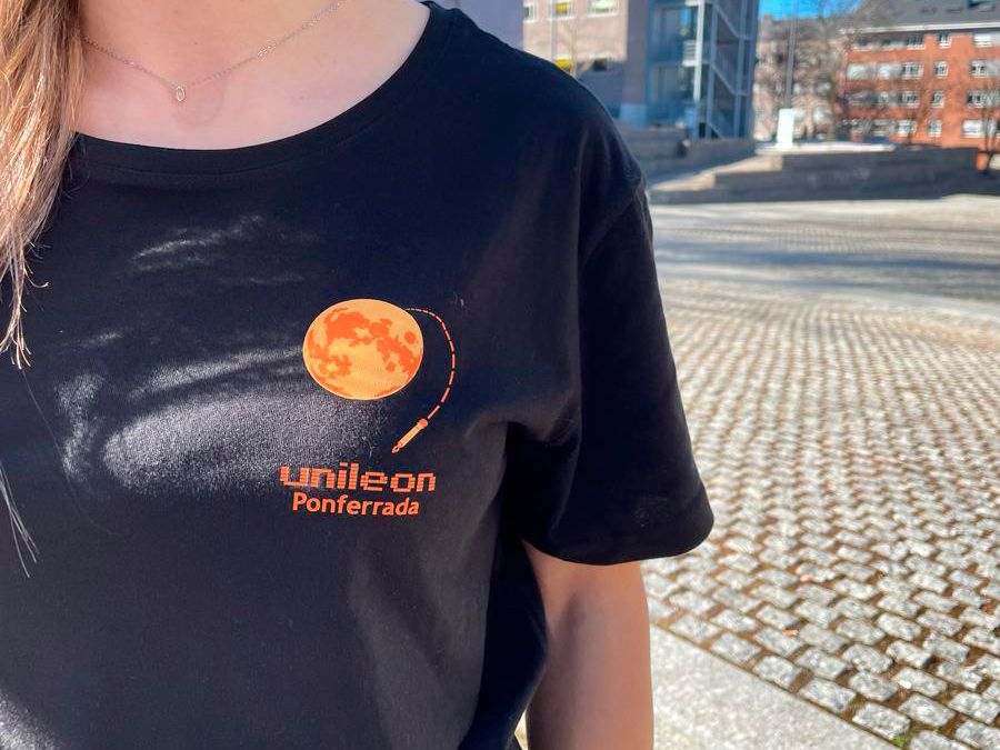 Los alumnos del Campus de Ponferrada han querido homenajear la visita de la astronauta Sara García recibiéndola con una camiseta con un exclusivo y personalizado diseño dedicado a la leonesa. La impresión que aparece en la camiseta ha sido obra del diseñador berciano Alejandro De La Fuente Vidal, que ha combinado la cara de Sara, con un satélite -la Luna o Marte- y separados por un cohete despegando.