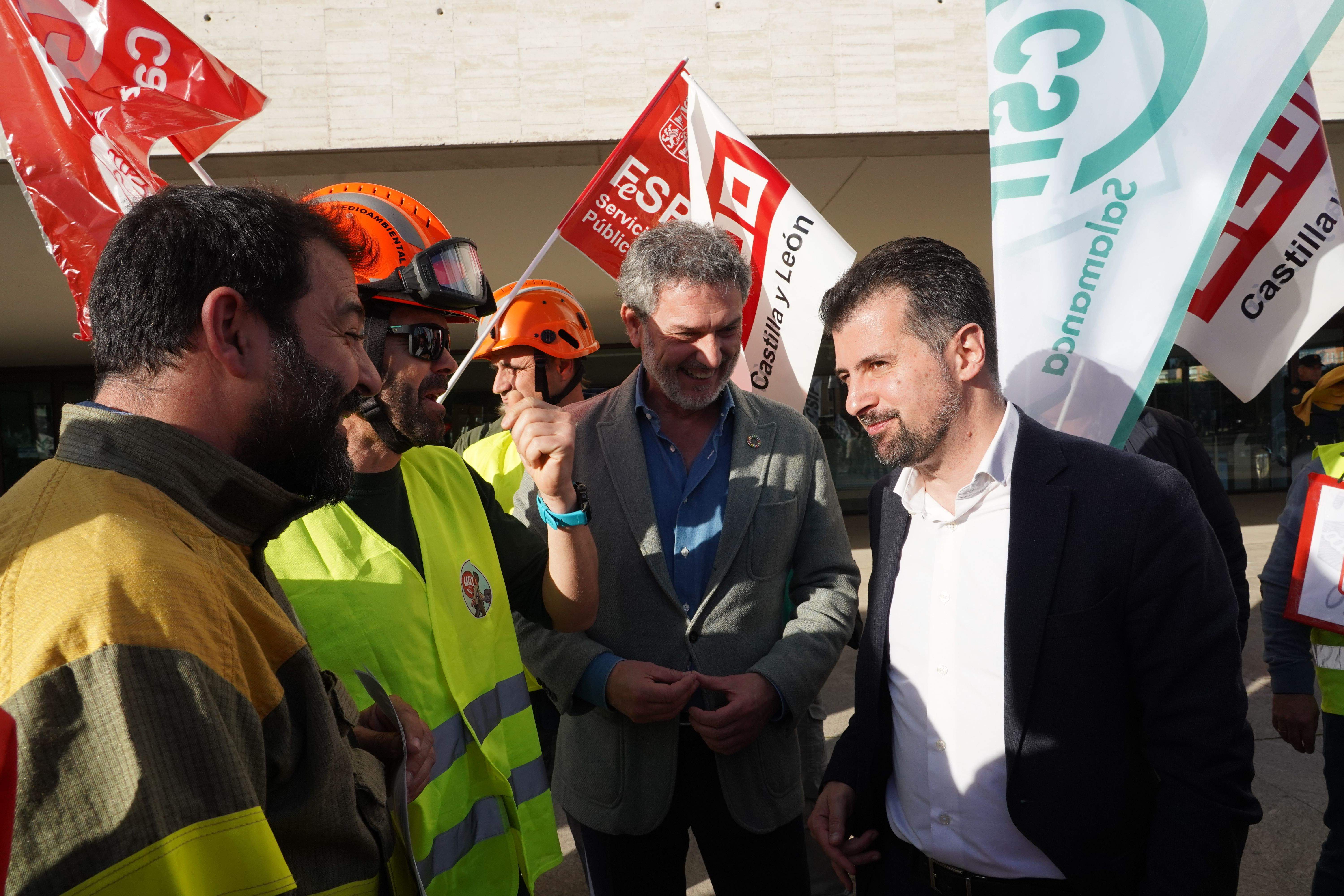 Los trabajadores del operativo de incendios forestales se movilizan por el futuro decreto que regulará esta actividad y las guardias, convocados por CSIF, UGT, CCOO y Uscal.El portavoz del Grupo Socialista, Luis Tudanca,; el de Soria Ya, Ángel Ceña; el de UPL, Luis Mariano Santos, y el de Podemos, Pablo Fernández, salieron a conocer las reivindicaciones de estos trabajadores tras las preguntas orales de la primera sesión del Pleno de las Cortes.