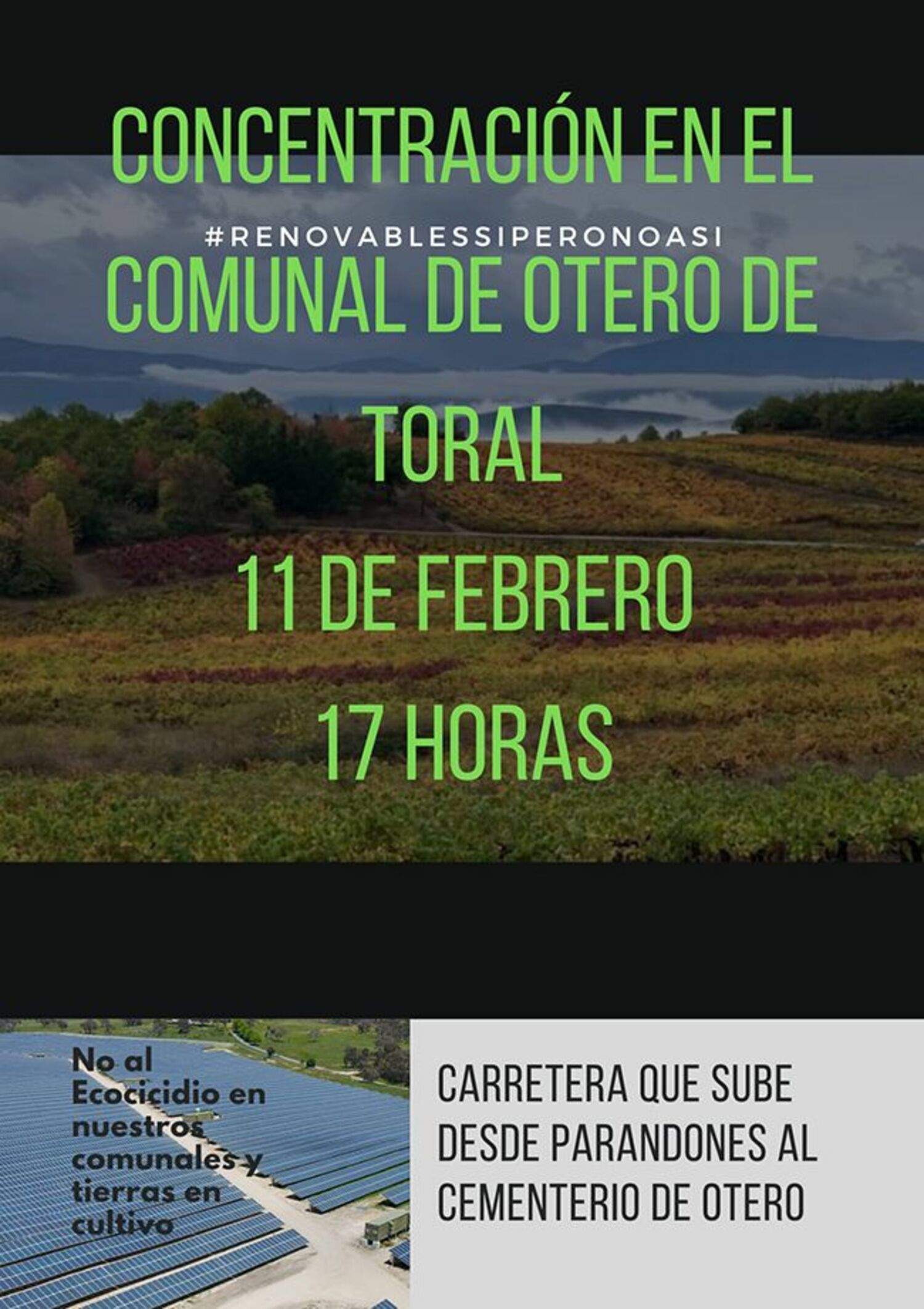 Ante la proliferación de proyectos solares y eólicos en la zona noroeste del país, "que nada tienen que ver con el respeto y el cuidado del medio ambiente (como se intenta vender con el plan de transición -in-justa) creemos necesaria la movilización y lucha ciudadana. No podemos permitir que una comarca como El Bierzo, con una tierra tan rica, y siendo la única demarcación administrativa de España reconocida con siete sellos de calidad en sus productos alimenticios, se vea arrasada por los intereses de grandes empresas que presentan proyectos, en muchos casos fraccionados para ocultar un gran despliegue; y en otros muchos casos promulgados por sociedades de reciente creación, con capitales mínimos y sin recorrido empresarial. No podemos permitir que se especule con nuestro suelo, nuestro modo de vida y nuestro futuro. Somos conscientes de la necesidad de atraer industria a la zona tras el cierre de las térmicas, pero no a toda costa y sacrificando lo que ya hay aquí; queremos empleo de calidad, que ayude a la comarca a crecer y mejorar, y no que la conviertan en el motor energético de las grandes ciudades del país."