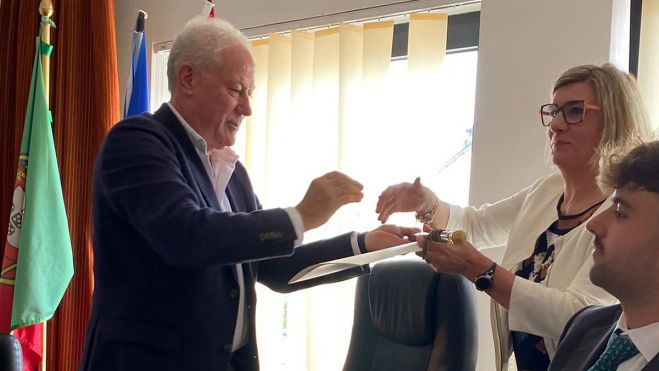 Fue la escena curiosa de la jornada de investidura en El Bierzo. Los dos ex compañeros de filas, enfrentados en las urnas el pasado 28 de mayo, y ambos regidores del municipio. Como edil de mayor edad, Demetrio Alfonso Canedo fue el encargado de entregar el bastón de mando a Martínez.