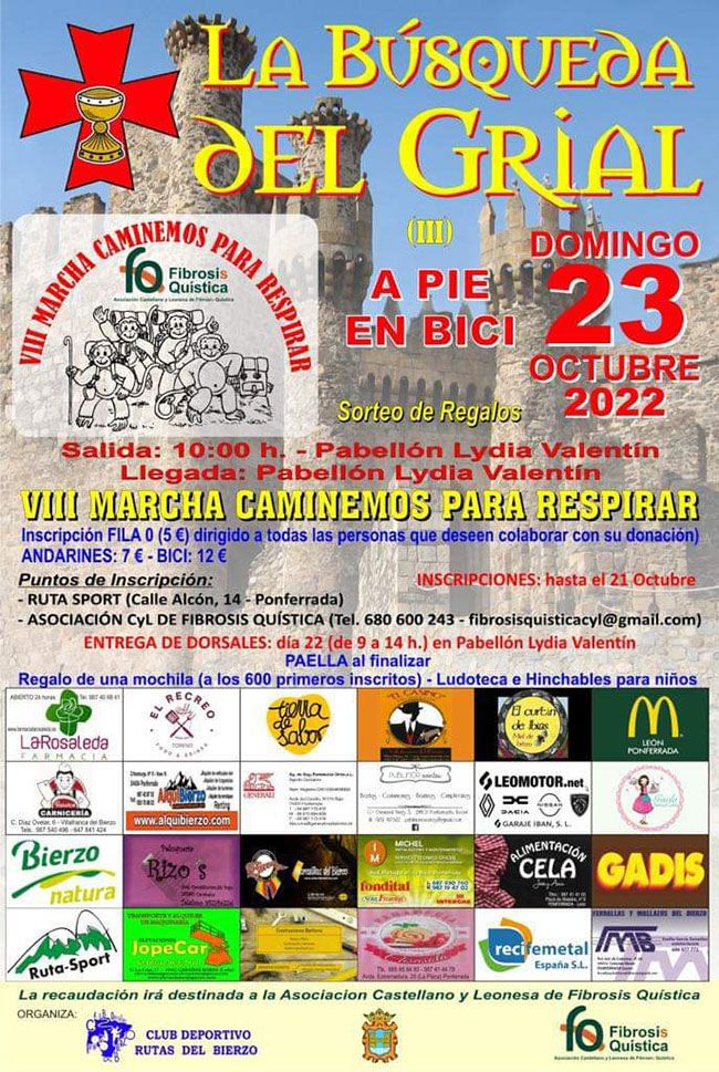 Las inscripciones están abiertas hasta el día 21 de octubre en Ruta Sport (Calle Alcón 14, Ponferrada) y Asociación de Castilla y León de Fibrosis Quística (tfno. 680600243 y fibrosisquisticacyl@gmail.com) al precio de 7 euros los andarines y 12 euros los que participen en la marcha ciclista.