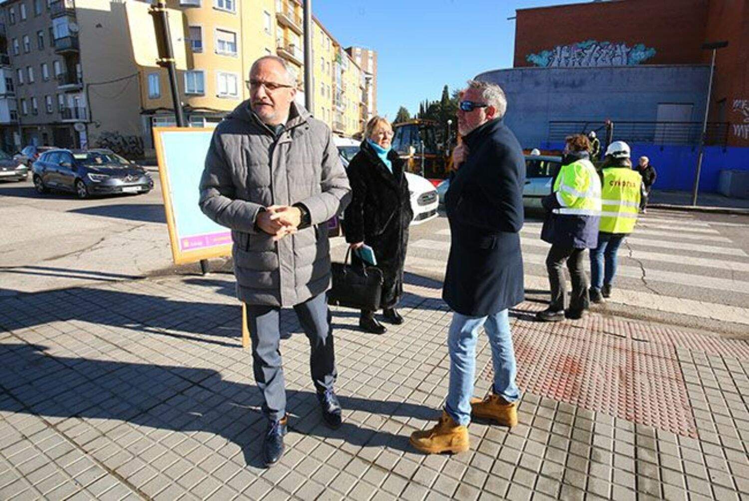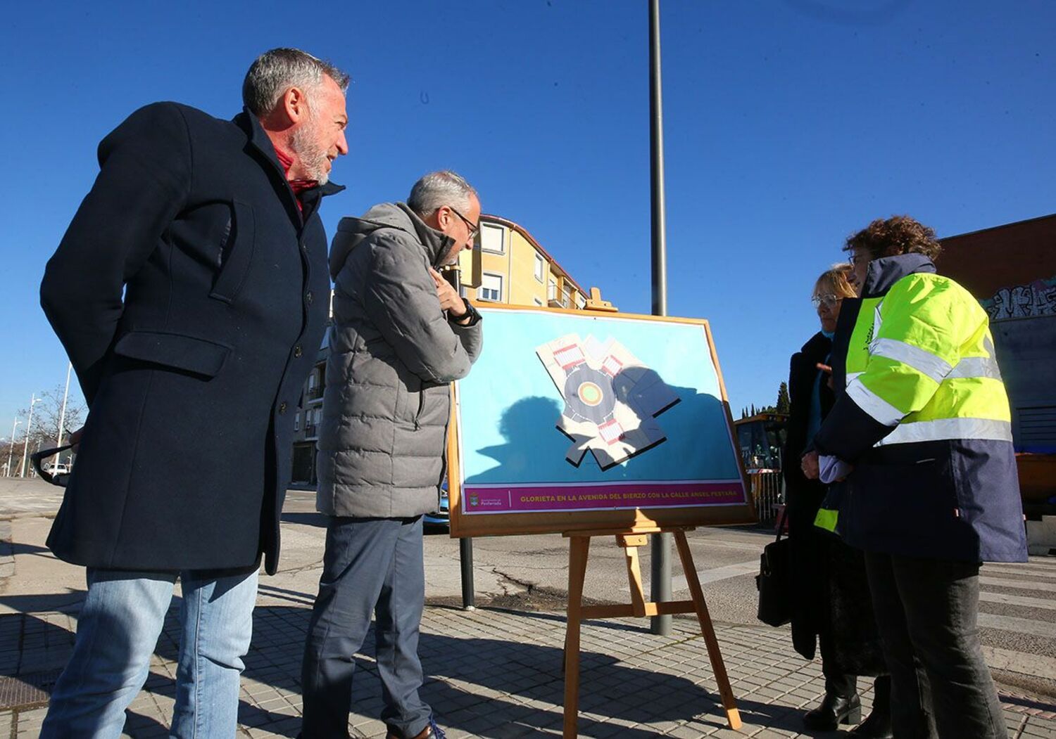 Foto: El alcalde de Ponferrada, Olegario Ramón (2I), junto a la concejala de Infraestructuras, Carmen Doel (2D), y el concejal de Seguridad Ciudadana, José Antonio Cartón (I), durante la visita a la obra de la nueva glorieta en la avenida del Bierzo / César Sánchez - ICALAl respecto, Ramón subrayó que la nueva glorieta aliviará el “problema serio de circulación” que se producía en esta intersección, desde la que se accede a equipamientos como las piscinas municipales y el pabellón de deportes de la zona alta, el campus universitario o la escuela infantil Camino de Santiago. “Es una obra muy solicitada”, resumió el alcalde, que compareció acompañado de la concejala de Infraestructuras, Carmen Doel, y del edil de Seguridad Ciudadana, José Antonio Cartón.