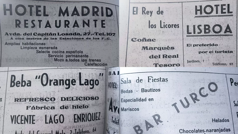 En las imágenes recuperadas se pueden observar anuncios de comercios que han ido cerrando, pero otros como Casa Brindis que luchan contra viento y marea para mantener abiertas sus puertas. Entre los negocios, encontramos anuncios de la farmacia Leopoldo Nieto, ahora de Sonsoles Ysart; Almacenes Bonifacio fundados en el año 1890, que se ubicaban en la plaza de Lazúrtegui o la tienda de ultramarinos Casa 'El Turco'.