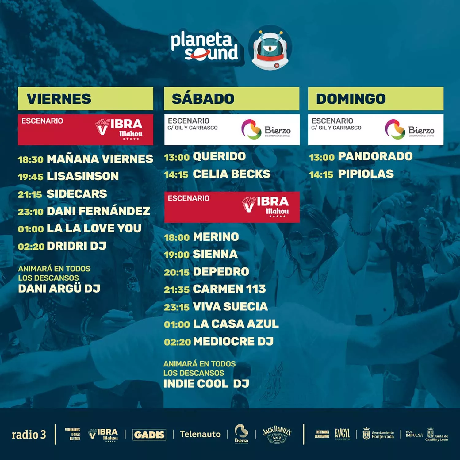 La capital del Bierzo se pone en pie este viernes, 12 de julio, en el escenario Vibra Mahou para dar comienzo al festival indie por excelencia de Ponferrada: el Planeta Sound. La música de Mañana Viernes, Lisasinson, Sidercars y Dani Fernández caldearán esta jornada que cerrará con la actuación de La La Love You, además del ritmo con el Dj Dridri.