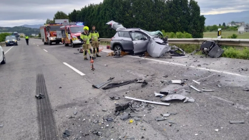 Por causas desconocidas, un turismo ha invadido el carril contrario, impactando frontalmente contra un camión. La conductora del vehículo quedó atrapada en el interior, siendo preciso forzar la apertura del portón trasero para sacarla por el mismo con la ayuda de un tablero espinal. La mujer ha sido trasladada al Hospital El Bierzo, en estado muy grave.