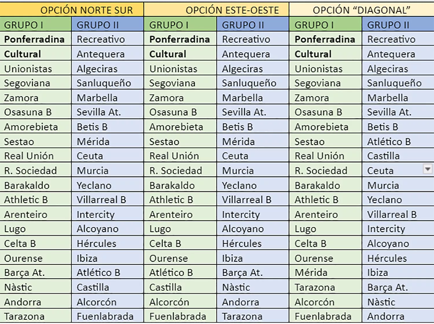 Se barajan, además, otras dos opciones de reparto. En una de ellas, la llamada este-oeste, los cuatro equipos madrileños (Alcorcón, Fuenlabrada, Atlético de Madrid B y Real Madrid Castilla) pasarían al grupo de la Deportiva y la Cultural, mientras que Andorra, Barcelona Atlètic, Nàstic de Tarragona y Tarazona cambiarían de ubicación. Incluso habría otra posibilidad, la que llamaríamos “diagonal” y en la que los equipos de León se verían beneficiados por kilometraje, en la que la Comunidad de Madrid se dividiría y la Deportiva y la Cultural estarían con los otros tres equipos castellanoleoneses, seis de Euskadi, cuatro gallegos, dos madrileños, el navarro, el aragonés y el extremeño. Quedarían Andorra, Real Murcia, Ceuta, Ibiza y Yeclano con los siete andaluces, dos madrileños, cuatro de la Comunidad Valenciana y los dos catalanes.