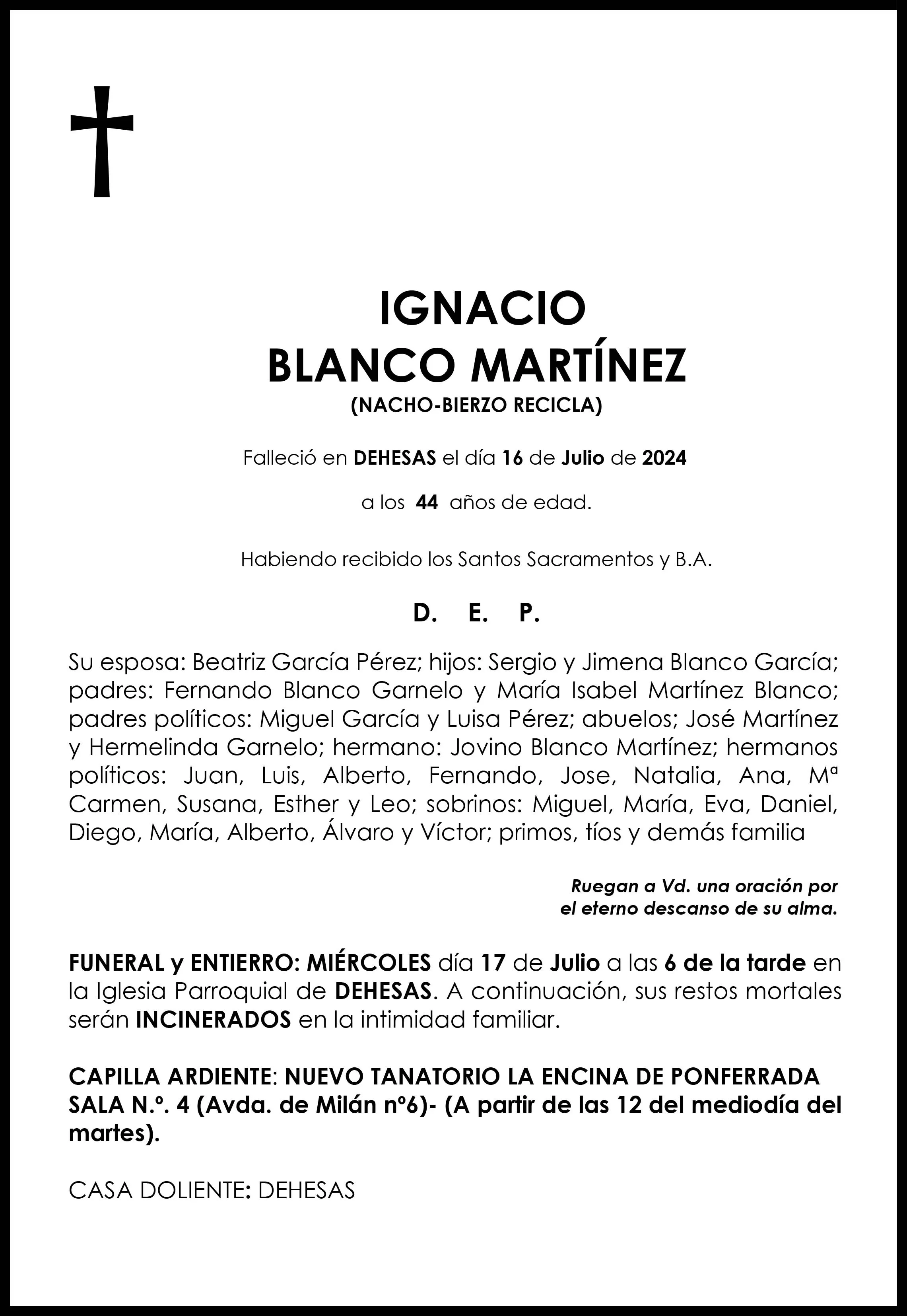El funeral y entierro tendrá lugar este miércoles 17 de julio a las 18.00 horas en la Iglesia Parroquial de Dehesas y a continuación sus restos mortales serán incinerados en la intimidad familiar. La capilla ardiente está abierta desde las 12:00 horas del mediodía de este martes en el Nuevo Tanatorio de La Encina de Ponferrada sala nú,ero 4 Avenida de Milán número 6.