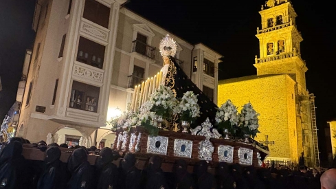 La procesión de La Soledad volvió a llenar de recogimiento las calles de Ponferrada en la noche de este Sábado Santo. La imagen de Nuestra Señora de la Soledad salió a las 22:00 horas desde la Basílica de Nuestra Señora de la Encina, en una de las citas más solemnes y emotivas de la Semana Santa ponferradina.