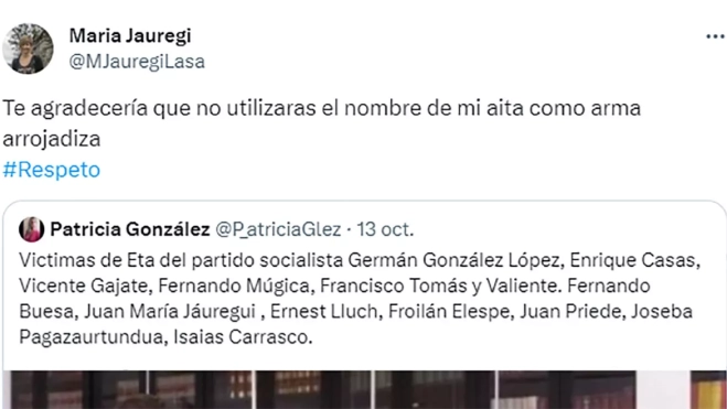 Fue entonces cuando la hija de uno de los citados, María Jauregi le respondió, también a través de X/Twitter. "Te agradecería que no utilizaras el nombre de mi aita como arma arrojadiza #Respeto", escribía.