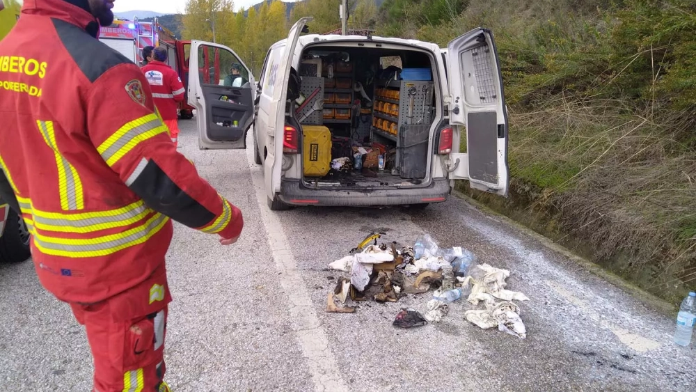 Al llegar, el incendio ya había sido extinguido por el conductor del vehículo, por lo que las labores se centran en atender al acompañante que presenta quemaduras en cara y antebrazos hasta la llegada de los servicios sanitarios que procedan a su traslado al Hospital El Bierzo.