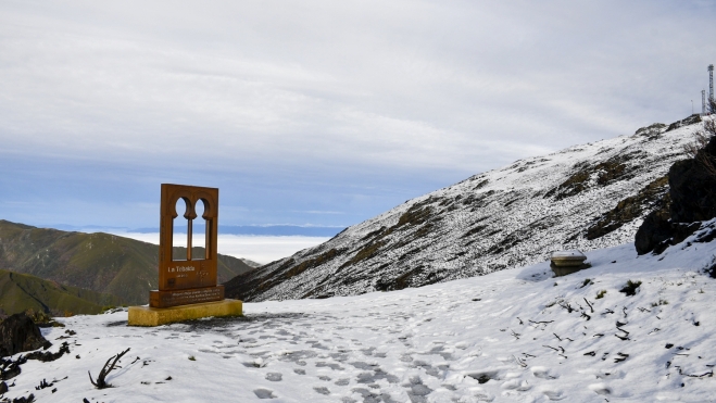El emblemático mirador de la Tebaida, situado en Peñalba de Santiago, ha amanecido cubierto por una capa blanca de nieve que transforma su entorno habitual y creando un escenario espectacular que atrae la atención tanto de residentes como visitantes.