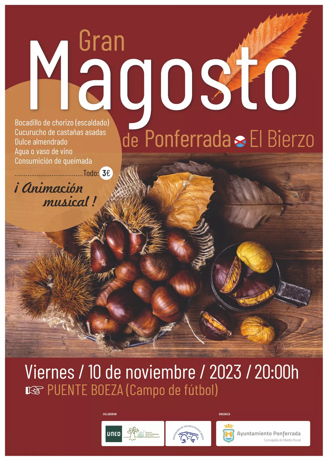 Un evento lúdico y de exaltación de una de las enseñas gastronómicas de El Bierzo, la castaña; a través de un Magosto Popular en el municipio de Ponferrada. Organizado por el Ayuntamiento de Ponferrada, la participación de la Cátedra de Turismo Sostenible de la UNED y la colaboración de la Asociación de Vecinos Puente Boeza.