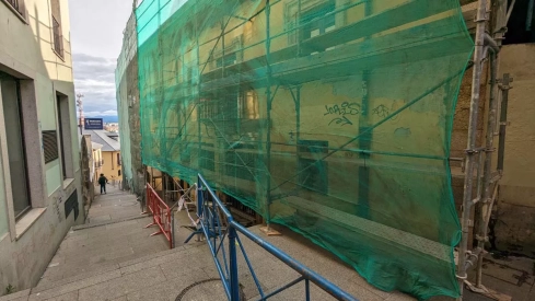 Los propietarios de los inmubles de esta vía ponferradina ya ha comenzado con las obras de reparación de las fachadas de los edificios de la calle Rañadero. Durante la jornada del miércoles procedían a la instalación de andamios, malla y vallas alrededor del inmueble.