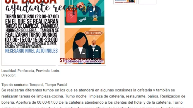 "Se realizarán diferentes turnos en los que se atenderá en algunas ocasiones la cafeteria y también se realizaran tareas de limpieza-cocina. Turno noche: limpieza de cafeteria, restaurante, baños. Realizacion de bollería. Apertura de 06:00-07:00 De la cafeteria atendiendo a los clientes del hotel y de la cafeteria. Turno cafeteria-recepción se atenderá a la vez las dos cosas. Sirviendo bebidas frías y calientes en la cafeteria; y atendiendo la recepción a su vez. Turno recepción tarde: se atenderá la recepción, con las tareas que le designe en la misma. Turno recepción mañana: se atenderá la recepción, con las tareas que le designe en la misma", enuncia la oferta publicada a través de la web Tablón de Anuncios.