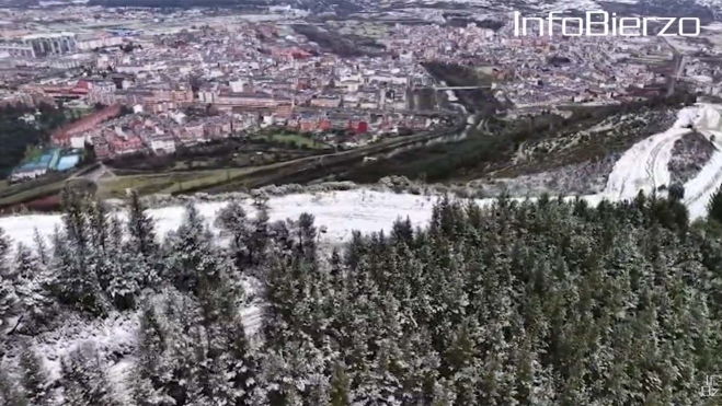 La reciente llegada de la borrasca Ingrid ha dejado una estampa invernal sobre la ciudad de Ponferrada, especialmente visible en la cima del Monte Pajariel. Esta montaña, que domina el paisaje local, ha aparecido cubierta por un manto blanco que refleja las intensas precipitaciones en forma de nieve registradas durante las últimas horas.