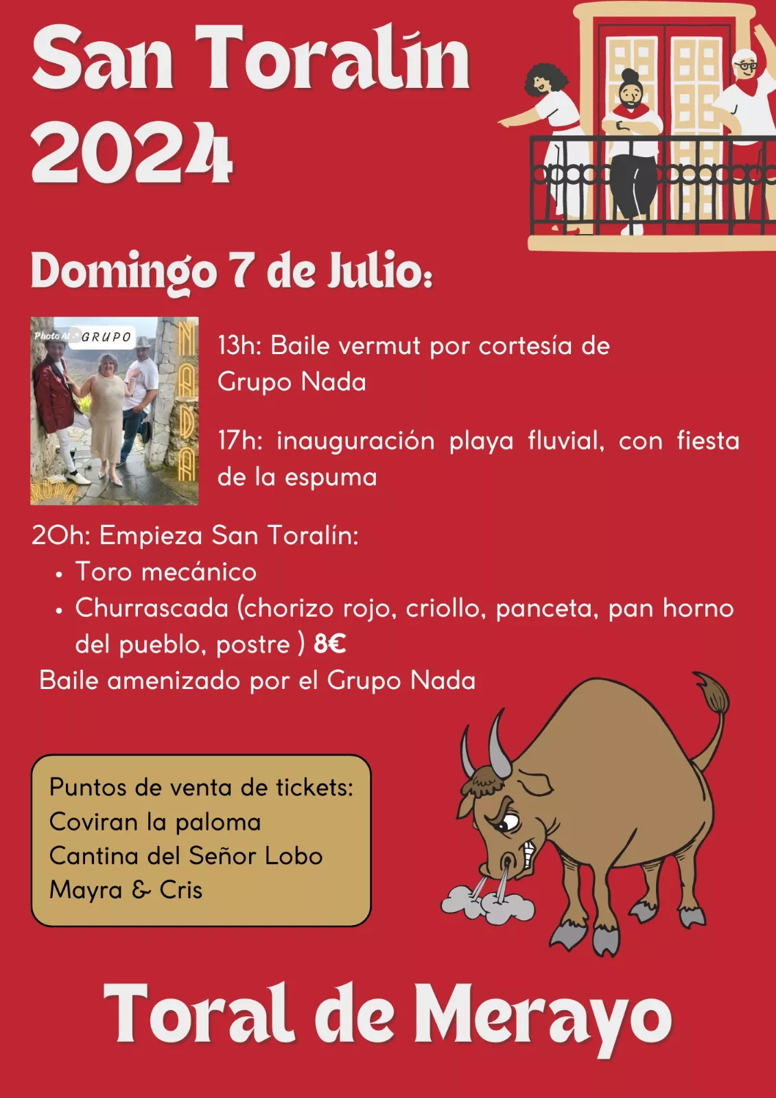 A las 20 horas empieza San Toralín y los más valientes podrán disfrutar de un toro mecánico, que está acompañado por una churrascada (chorizo rojo, criollo, panceta, pan del horno comunal y postre por 8 euros) y amenizado por el grupo Nada.