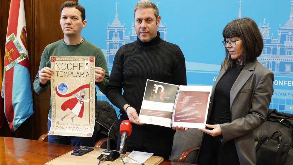 La Concejalía de Turismo del Ayuntamiento de Ponferrada, dirigida por Ivan Alonso, llevará este viernes a pleno el dictamen de la declaración de la Noche Templaria como Fiesta de Interés Turístico Regional. Así lo ha anunciado este martes el responsable del área junto a los técnicos de turismo Miguel Herrera y Laura Hurtado.