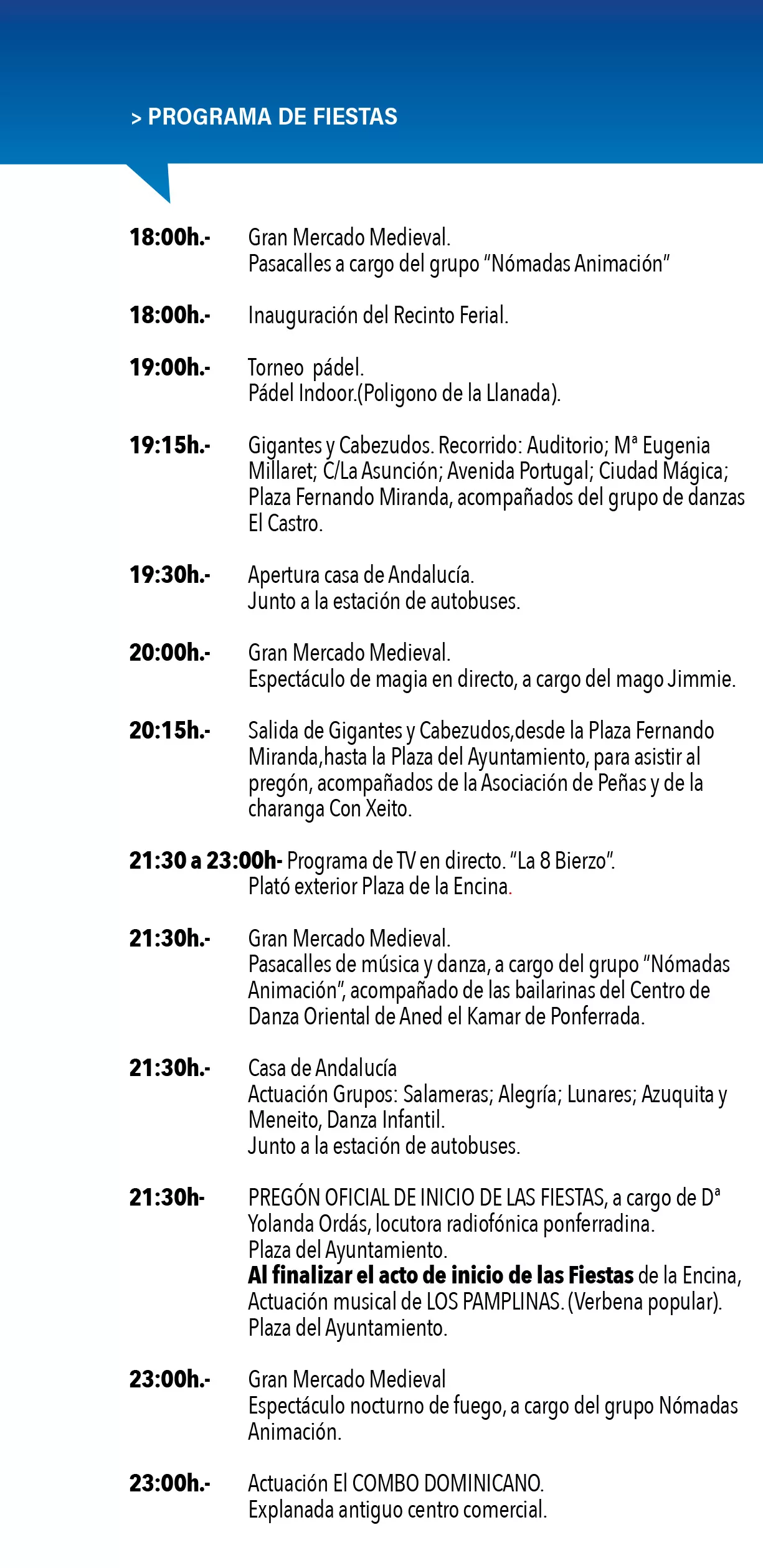 - 21.30h.- Pregón oficial de inicio de fiestas. Correrá a cargo de Yolanda Ordás, periodista y locutora ponferradina. Tendrá lugar en la Plaza del Ayuntamiento y al finalizar el acto se dará inicio a las Fiestas de La Encina con la actuación de 'Los Pamplinas' (Verbena popular).