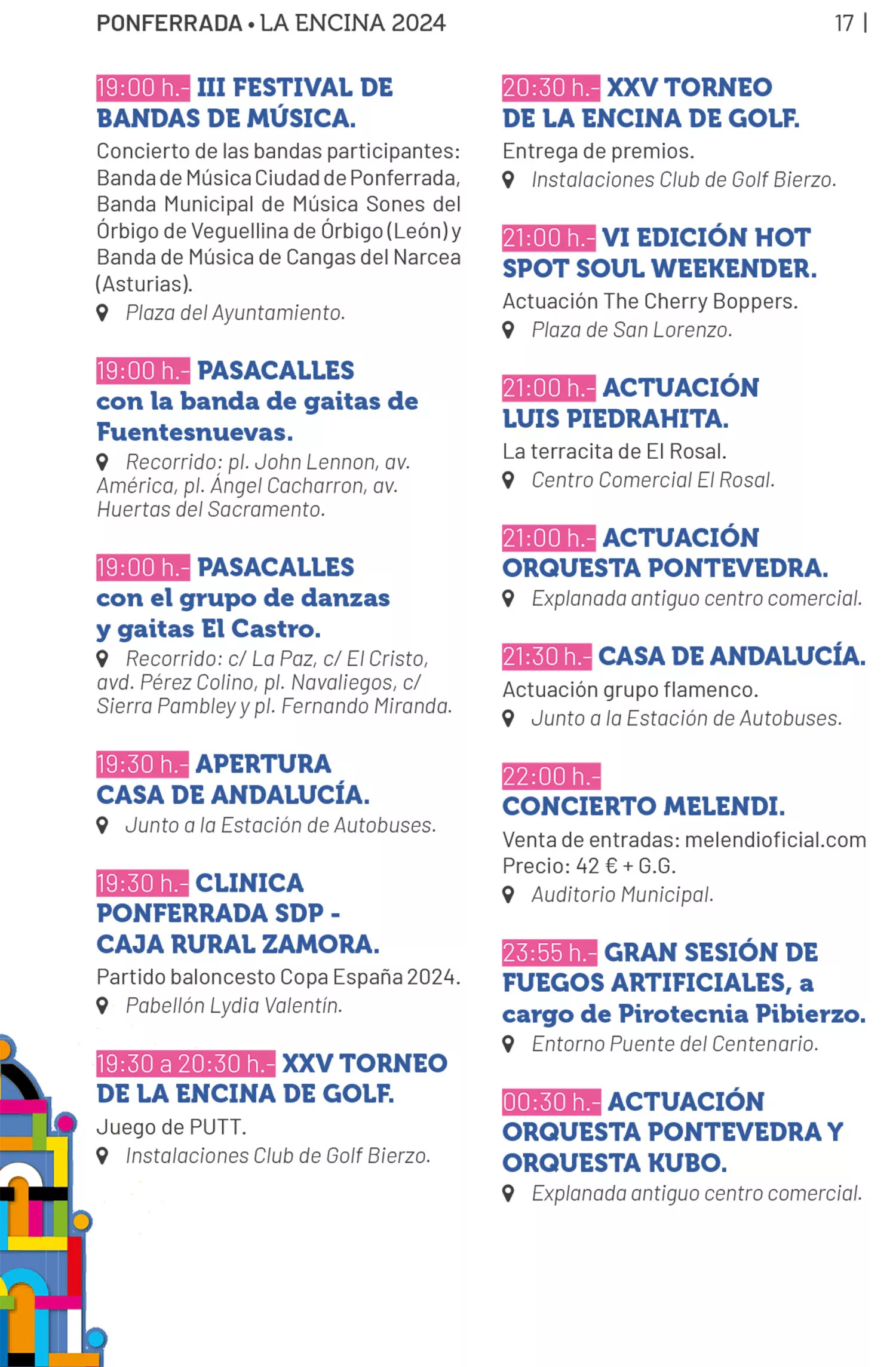 No obstante, no será hasta las 22:00 horas cuando llegue el plato fuerte de estas fiestas. El esperado concierto de Melendi tendrá lugar en el Auditorio Municipal y tras ello comenzararán los fuegos artificiales a las 23:55 horas con una gran sesión a cargo de PiBierzo. en el entorno del Puente del Centernario.