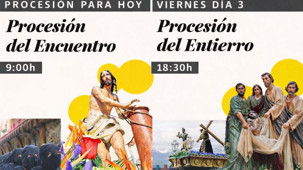 La jornada arrancará a las 09:00 horas con la Procesión del Encuentro, organizada por la Real Hermandad de Jesús Nazareno, con salida desde la Iglesia de San Andrés. En ella participarán los pasos de Oración en el Huerto, Flagelación, Ecce Homo, Jesús Nazareno, San Juanín, Nuestra Señora de la Soledad y la Santa Cruz.