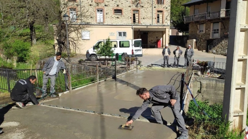 Se trata de estudiantes del taller de empleo de ‘Pavimentos y albañilería’, quienes procedieron a limpiar la zona, regularizar el pavimento y ejecutar losa de hormigón armado de 15 centímetros, al que se le dio un acabado con hormigón impreso. También se colocó una canaleta de hormigón con rejilla para la recogida de las aguas y evitar el embalsamiento de la misma.