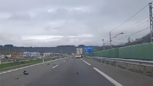 Ahora la zona donde se ha producido el suceso sí presenta algunas dificultades para la circulación, pues los restos del material de la rueda están dispersados a lo largo de la calzada.