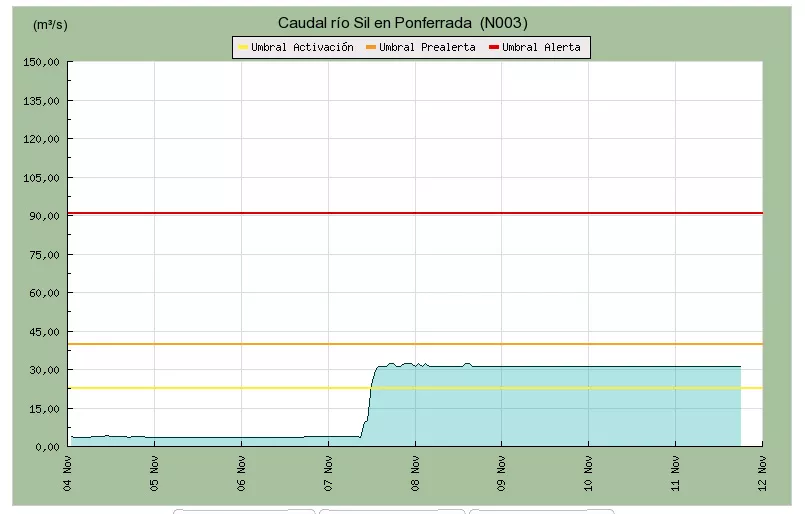 Si hace una semana hablábamos de crecida y algunos umbrales de activación, lo cierto es que ahora el Sil ya roza el siguiente escalón, el umbral de prealerta en el caso de Ponferrada y Requejo. El resto de caudales de la Comarca también siguen presentando índices por encima de la media, pero se mantienen por debajo de los umbrales.