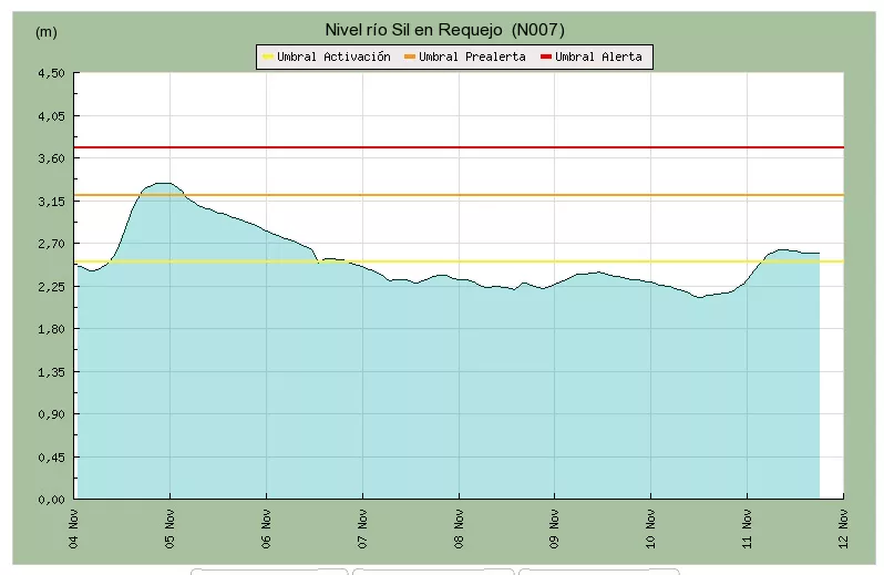 La web de la CHMS no muestra el caudal del Sil en Requejo, pero sí su nivel, que se encuentra en los 2,59 metros y ya superando el umbral de activación. El de prealerta se encuentra marcado en los 3,15 metros y parece que, al menos por el momento, se encuentra todavía lejos de alcanzarlo.