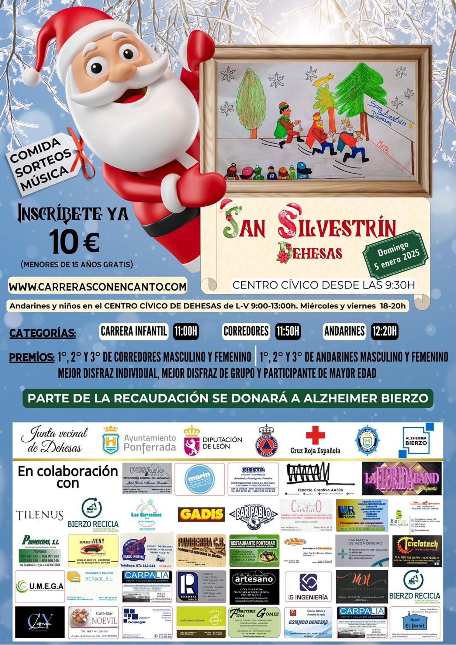 Con respecto a las inscripciones, los andarines y niños podrán inscribirse en el Centro Cívico de Dehesas. Por otro lado, los corredores y andarines podrán registrar su inscripción en la web www.carrerasconencanto.com . Los menores de 15 años no pagan el dorsal, aunque la cuota general de inscripción es de 10 euros. Además, será solidaria ya que parte de la recaudación será a dona a Alzheimer Bierzo.