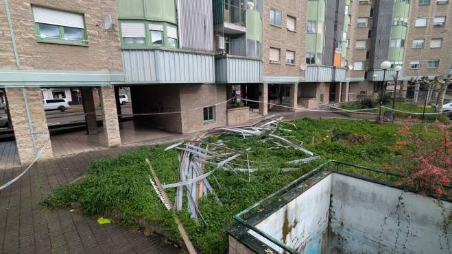 Según el jefe de servicio de los Bomberos de Ponferrada, Olivier Bao, el suceso tuvo lugar el jueves aunque ya se encuentra solucionado: "Se trata de unos listones de aluminio que van de arriba a abajo del edificio y afectó a tres portales".