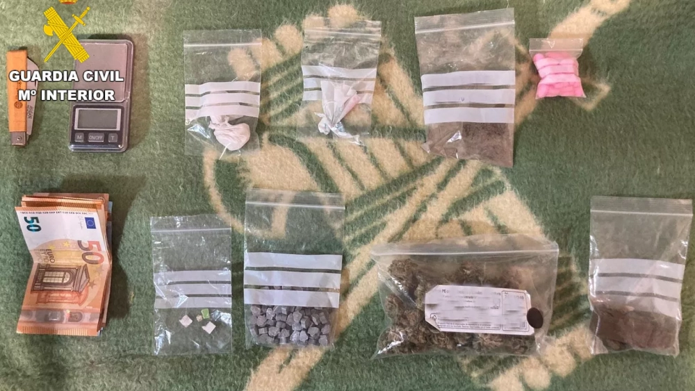En el domicilio se encontró "una báscula pequeña, 300 euros en cuatro billetes de 50 euros y en cinco billetes de 20 euros, 170 euros en un billete de 50 euros y 6 billetes de 20 euros, un envoltorio de plástico con al parecer cocaína, una bolsita pequeña de, al parecer hachís, cuatro bolsitas pequeñas de al parecer marihuana, una bolsa más grande de, al parecer marihuana, once bolsitas con al parecer marihuana, 335 euros en 12 billetes de 20 euros, 7 billetes de 10 euros y 5 billetes de 5 euros, una pastilla y media de color amarillo con el dibujo de una cara y 23 billetes de 20 euros falsos", explica el escrito de calificación.