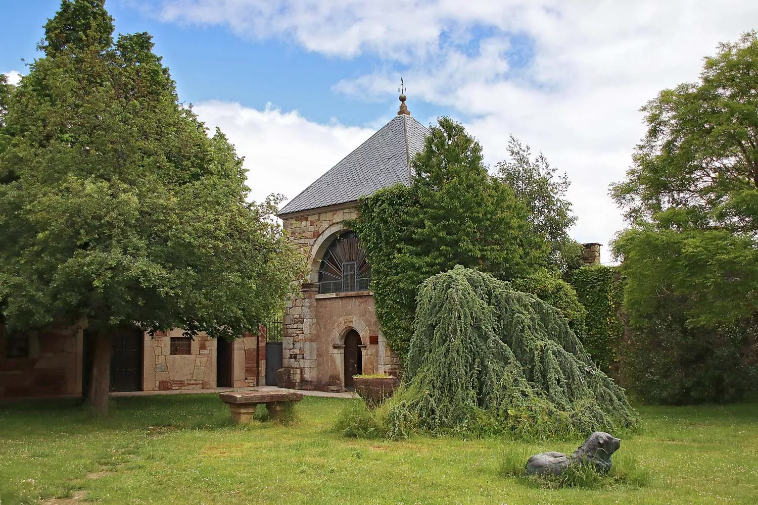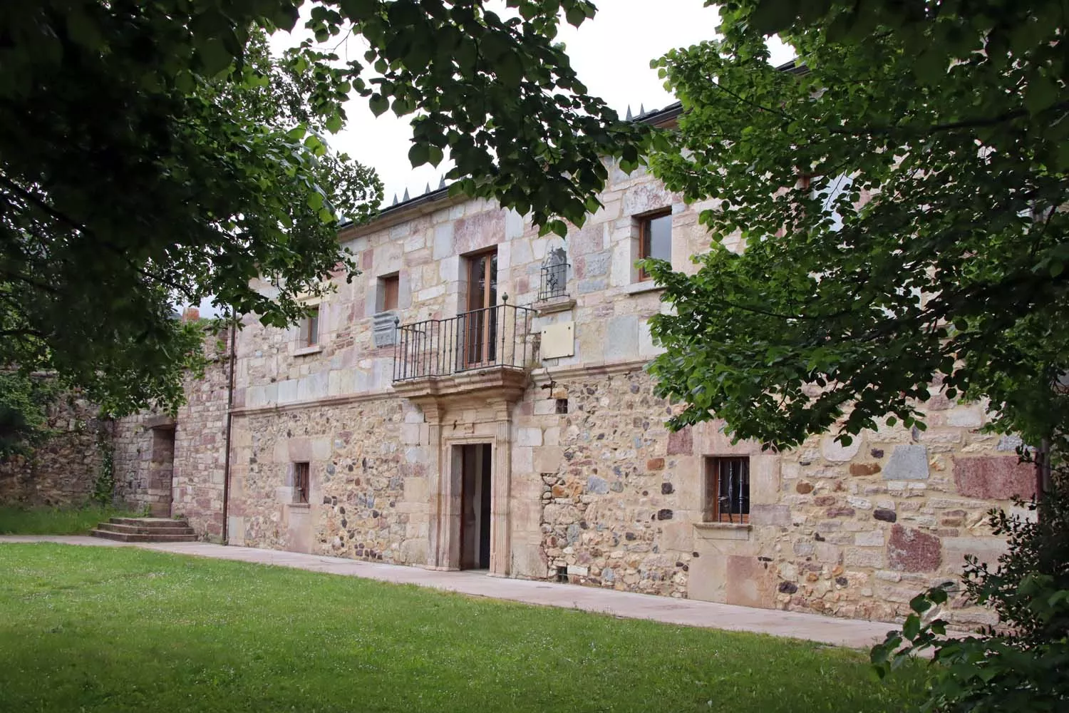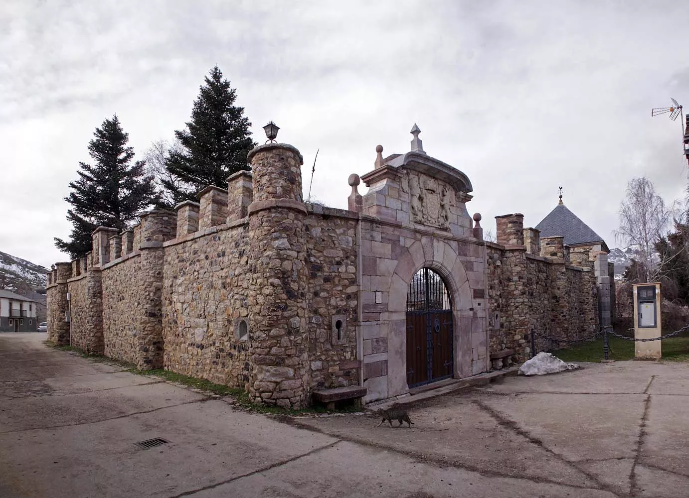 Un mastín de bronce recibe al visitante en un recinto acogedor en el que el verde y la piedra comparten protagonismo como primer impacto visual antes de adentrarse en el edificio, declarado Bien de Interés Cultural. El inmueble, propiedad de la Junta, data del siglo XIV, cuando se construyó su muralla, pero la portada y las edificaciones no se levantaron hasta finales del XVI y principios del XVII. A principios del siglo pasado sufrió un incendio que destruyó por completo su estructura interior y fue restaurado por un vecino, Fernando Geijo, en la década de los 70.