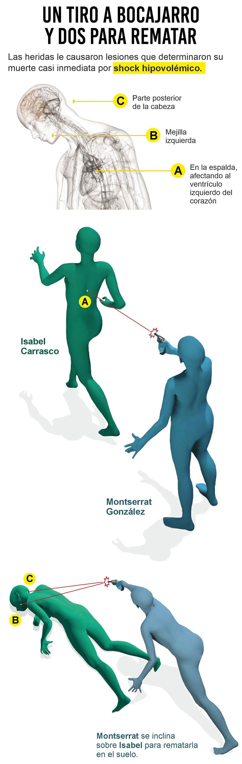 En ese momento, según recogió todo el auto judicial, madre e hija se separan, Triana se queda de compras en la zona de la inmaculada; Montserrat va hacia hasta la avenida Condesa, lugar donde vivía la víctima. Una vez cerca del ambulatorio de dicha avenida, y al verla caminando sola hacia la sede del partido, la interceptó con un disparo por la espalda, que se sucede de otros dos disparos cuando Carrasco ya estaba tendida en el suelo de la pasarela, conocida popularmente como el Puente de las luces.