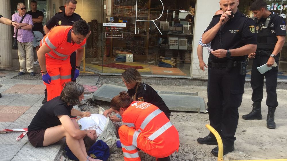 El suceso tuvo lugar poco antes de las seis de la tarde a la altura del número 4 de la calle Villa Benavente, junto a la Plaza de las Cortes Leonesas. La señora, que estaba acompañada de su marido, quedó tendida en el suelo y fue atendida por efectivos de la Comisaría Nacional de Policía, situada justo al lado del lugar del suceso, hasta la llegada de una ambulancia. También acudió al lugar una patrulla de la Policía Local.