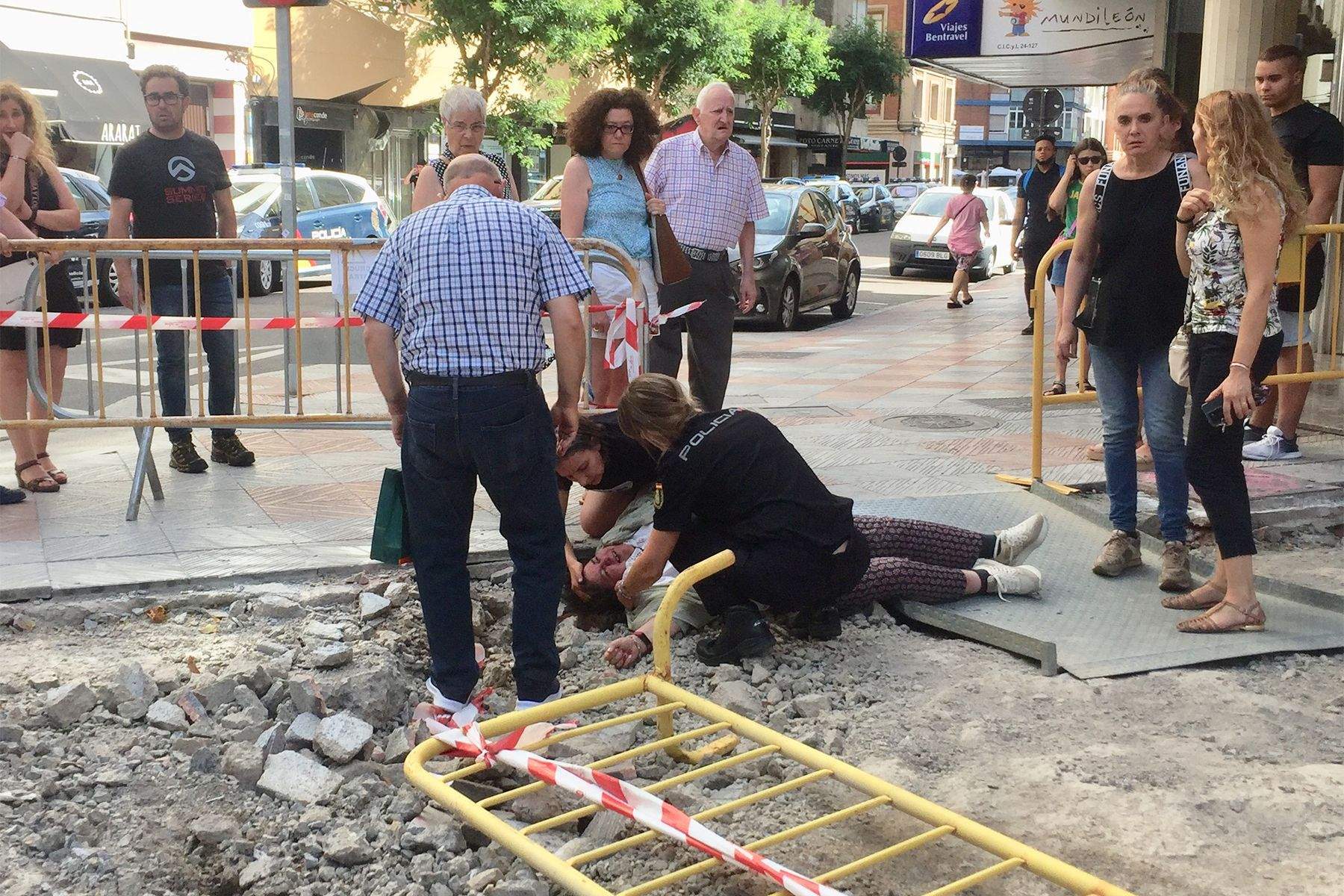 Una mujer de mediana edad resultó herida esta tarde después de que la pequeña pasarela metálica ubicada en un desnivel de una obra a pie de calle se desplazase y provocase su caída al suelo.