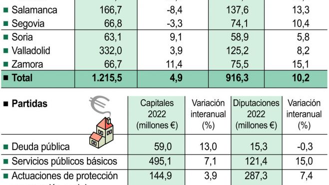 Las diputaciones destinarán a producción de bienes preferentes 81,3 millones, con un crecimiento del 10,9 %, con mayor aumento en Zamora (6,9 millones), del 31 %; y Palencia (11,9), 22,2 %. A deuda pública se desviará un gasto de 15,3 millones, un 0,3 % menos que en 2021, donde no aparecen gastos ni de León ni de Salamanca.