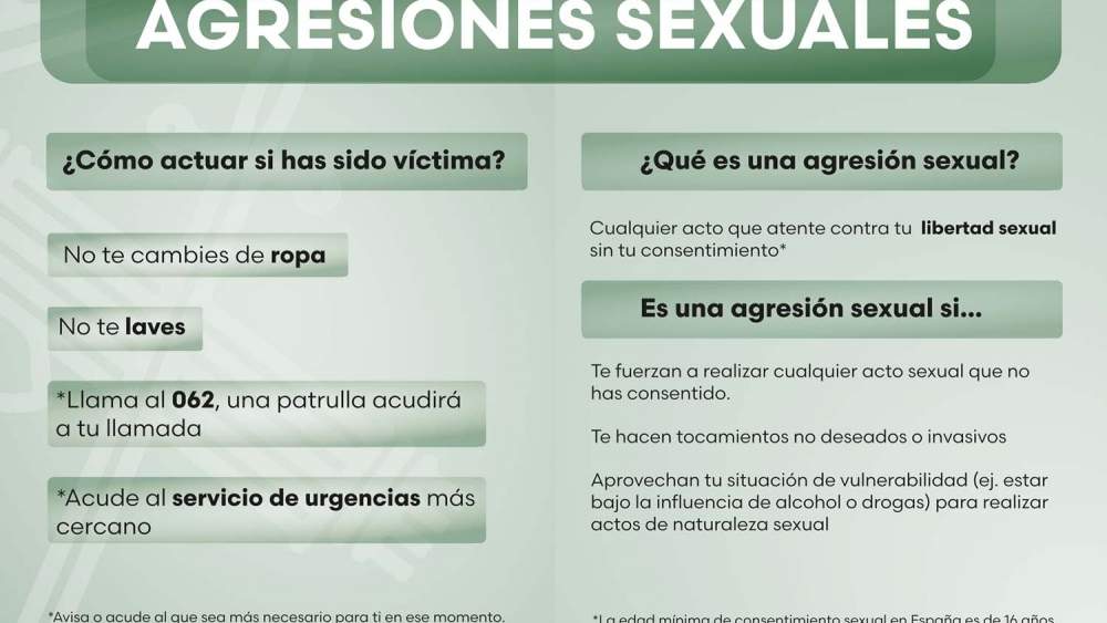 Desde la Comandancia provincial recuerdan que una agresión sexual es cualquier acto que atente contra la libertad sexual de una persona sin su consentimiento. Esto incluye desde tocamientos no deseados hasta cualquier forma de contacto físico de carácter sexual forzado, especialmente en situaciones de vulnerabilidad como el consumo de alcohol o drogas. En España, la edad mínima de consentimiento sexual es de 16 años.