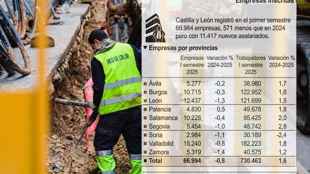 Castilla y León cerró el primer semestre de 2025 con menos empresas activas pero más empleo asalariado, según los últimos datos publicados por el Ministerio de Trabajo y Economía Social. En la provincia de León, el tejido empresarial se redujo respecto a junio del pasado año un 1,3 % en los últimos doce meses, hasta quedar en 12.437 empresas cotizantes a la Seguridad Social, pero, en paralelo, el número de trabajadores aumentó un 1,5 %, alcanzando los 121.699 asalariados.