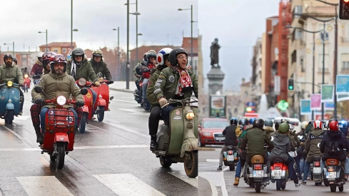 Un año más la ‘Scooter Run’ organizada con motivo de la celebración del festival musical Purple Weekend Estrella en León recorrió las calles de la ciudad para dar un colorido toque sobre ruedas a la cita musical por excelencia del otoño en la capital.