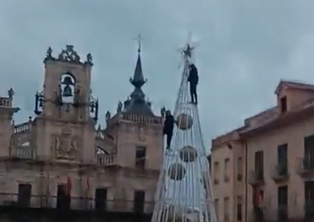 El vídeo ya se ha hecho viral en redes sociales. En él se puede observar como dos personas han trepado por el árbol ubicado en la Plaza del Ayuntamiento de Astorga. Al resepcto, la Policía astorgana ya se encuentra en plena investigación con el objetivo de dar con estas dos personas.