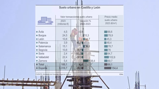 Respecto al precio, Castilla y León repite como el territorio con precio medio del metro cuadrado de suelo urbano más barato de España, con 69,1 euros en 2023, el último dato disponible, por debajo de los 70,64 euros de 2022. En España, se situó en 154,4 euros, un 2,8% menos que el año pasado.