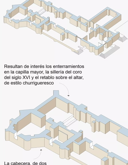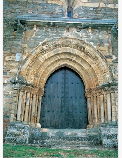 En la estructura general y en su portada, el templo presenta elementos románicos, pero también trazas góticas, como el ábside construido durante la ampliación del siglo XV. Sobre las claves de sus bóvedas están esculpidos los escudos de armas de los marqueses de Villafranca. Por otro lado, del siglo XIII solo se conserva la portada del hastial occidental que está formada por un arco de medio punto, que se abocina en cuatro arquivoltas.