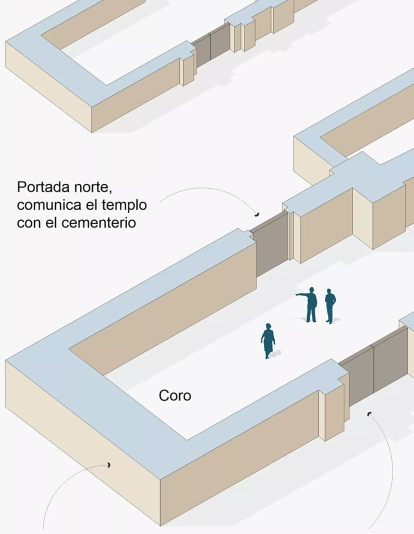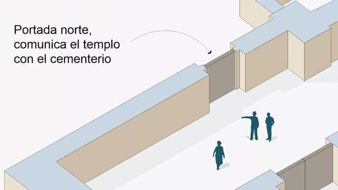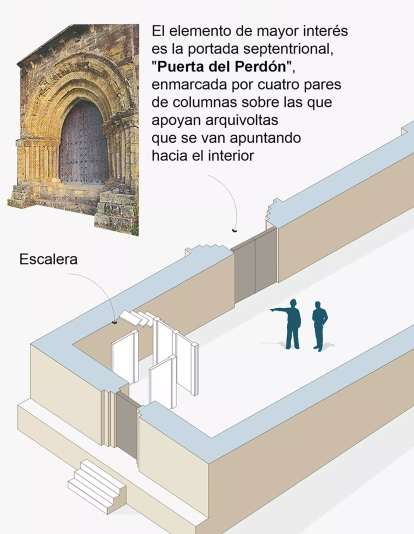 La iglesia, de planta rectangular y con una sola nave, destaca por su austeridad general, pese a que la conocida Puerta del Perdón posee detalles de gran belleza. Esta puerta se encuentra enmarcada por cuatro pares de columnas sobre las que apoyan arquivoltas que van apuntando hacia el interior. Además, la Puerta del Perdón está ricamente ornamentada con motivos florales, geométricos y escenas bíblicas del Ciclo de la Natividad.