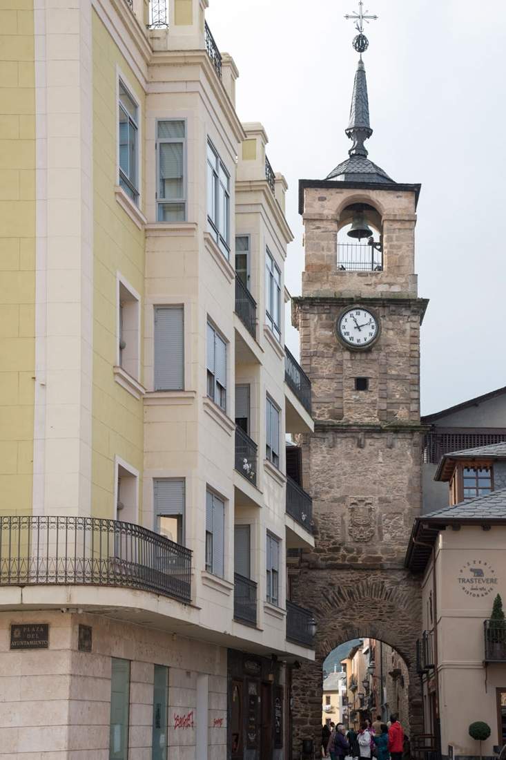 La Torre del Reloj, con su arco de medio punto, supone el último recuerdo de la antigua muralla medieval que rodeaba a la ciudad y la última puerta de las cinco que la formaban. Construida en antes del año 1597, es visible desde la Plaza del Ayuntamiento, antiguamente llamada Plaza de las Eras, sirve como puerta a la calle del Reloj y al casco histórico de la capital berciana.
