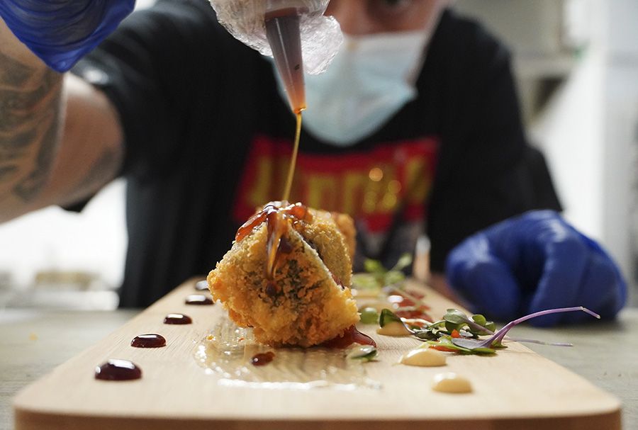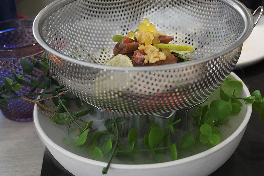 Un plato lleno de color, diversas texturas y sabores dispares, que sumándose todo resulta una experiencia interesante al paladar. Entre otros ingredientes se encuentran mahonesa de chilly dulce, esferificaciones de lima, salsa teriyaki junto con una costra de panko (pan japonés) .