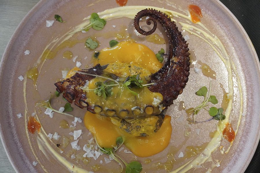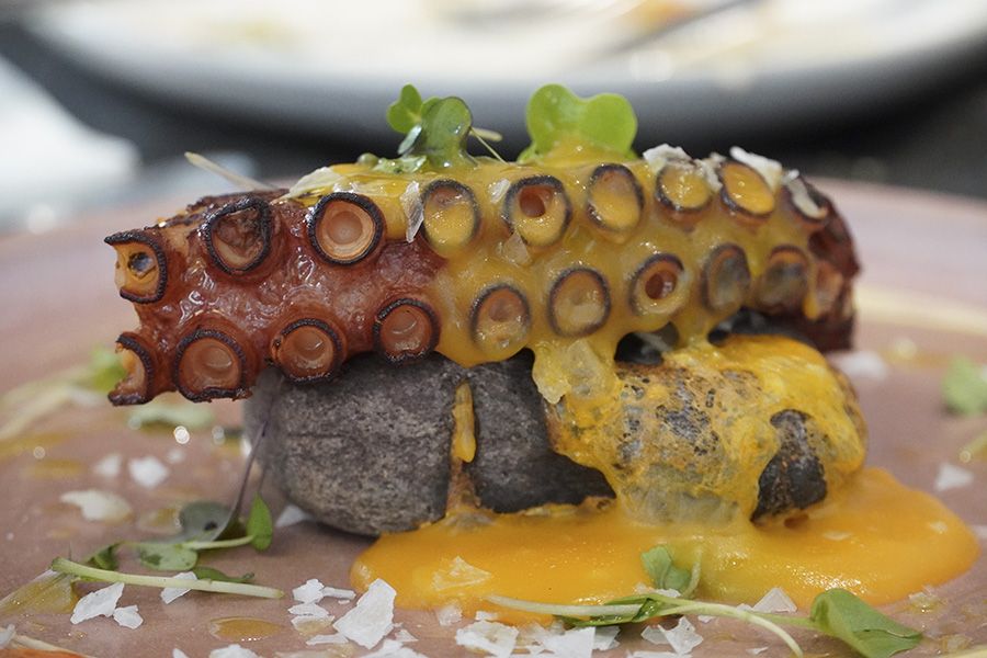 Un rabo de pulpo de calidad excelente, acompañado por una ‘patata y pimentón’ llevados a otro nivel gastronómico, acostado en piedra caliente. Una emulsión de yema de huevo será el hilo conductor del plato, con un toque de sal Maldon y de humo, que le dará el toque más tradicional de la tierra.